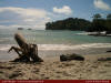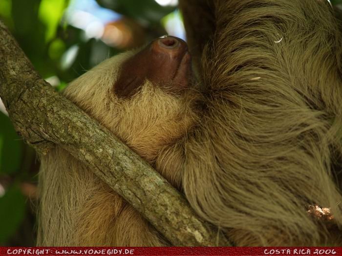 17.11. Jaco -> Matapalo 110 km Die Strasse ist anfangs erstklassig, ab Quepos grausam. Für die letzten 30km brauchen wir 50 Min. und das auch nur, weil ich die paar Stücke, die einigermassen in Ordnung sind, sehr zügig fahre. Es geht vorbei an endlosen Ölpalmen-Plantagen. Obwohl wir noch in den NP Manuel Antonio wollen, bleiben wir nicht in dem Touri-Ort Quepos, sondern nehmen die 30km Piste auf uns und fahren weiter nach Matapalo. Matapalo ist eigentlich nicht einmal ein Ort, nur eine Ansammlung von Häuschen. An der Playa Matapalo liegt, etwas versteckt den Weg am Strand entlang, die Lodge El Coquito del Pacifico (046). Inzwischen in US-Hand liegt sie sehr schön unter den Palmen am Strand. Sie könnte allerdings einmal wieder renoviert werden, der Vorpächter hat anscheinend nicht viel gemacht. Es ist wieder einmal herrlich, im warmen Pazifik zu baden und in der Brandung zu toben. Die Strömung hält sich in Grenzen und so ist es ungefährlich. Wir geniessen den fast leeren Strand im Schatten der Bäume und entspannen uns. Über uns hängt ein Faultier im Baum.