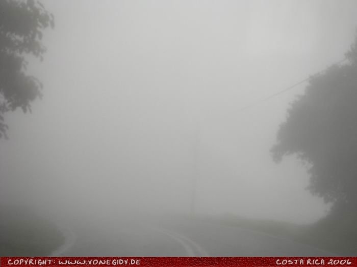 20.11. Matapalo -> Orosi 188 km Die ersten 25km bis Dominical geht es über ruppige Piste, die durch den starken Regen auch ordentlich schlammig ist. Kurz vor Dominical (048) geht es auf guter Landstrasse weiter nach San Isidro und von dort weiter auf der No. 2 (049) nach Cartago. Die gute Strasse windet sich auf über 3.000m in die Berge. Wir fahren oft in den Wolken, die tollen Ausblicke halten sich dadurch in Grenzen. Zum Glück ist wenig LKW-Verkehr, dadurch kommen wir zügig voran. Durch Cartago hindurch zu finden, um nach Orosi zu kommen, gestaltet sich mangels Wegweiser als recht schwierig. Grob gen Ost bzw. Südost (052-054) kommen wir schliesslich über Paraiso in den kleinen Ort. Leider ist die wohl sehr empfehlenswerte Orosi Lodge (055) ausgebucht. Der deutsche Besitzer empfiehlt das nagelneue Hotel Tapanti Media am Ortausgang (056). Es ist nett angelegt und ganz ok. Mittlerweise ist es deutlich kühler geworden. Das erste Mal in diesem Urlaub ist es mit langer Hose und langärmeligem Hemd sehr angenehm.