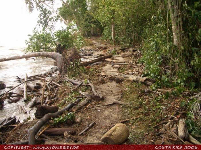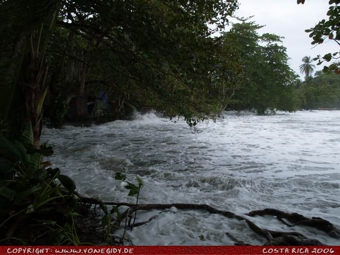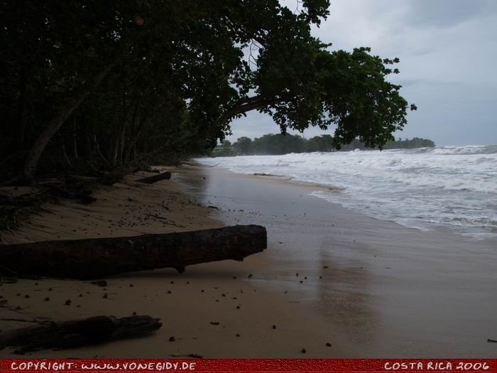 22.11. Cahuita 1 km Wir ziehen in das spanisch geführte Hotel Kelly Creek (066) um. Die Zimmer im Kelly Creek sind riesig und es ist sauber. Im Gegensatz zum Alby kommt hier auch wirklich warmes Wasser aus der Dusche. Eigentlich wären wir gerne in die Bungalows Aché, direkt neben der Alby Lodge, umgezogen, aber dort war kein Platz zu bekommen. Das Meer ist extrem aufgewühlt, die braungraue Brandung wälzt sich über den ganzen Strand hinweg bis fast zu den Häusern. Von dem hellen Strand des NP Cahuita – der sonstige Strand ist grauschwarz – ist nur etwas zu sehen, wenn das Meer neu Schwung holt. Vom Track durch den Park ist stellenweise nicht viel übrig geblieben, jede Menge Bäume sind entwurzelt und treiben im Meer oder liegen am Strand. Der restliche Track ist teilweise unterspült oder überschwemmt und mit jeder Menge Treibgut zugeschmissen. Von Karibikfeeling keine Spur. Wir sehen jedoch Kapuzineraffen, einen Greifvogel, Reiher, Faultiere und bewohnte Muscheln. Brüllaffen und andere Vögel hören wir meist nur. Die grossen, bunten Vögel verstecken sich weiterhin vor uns. Zurück am Kelly Creek werden wir von dem Papagei der spanischen Besitzerin mit einem „Hola“ begrüsst.