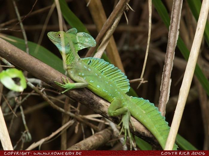 23.11. Cahuita -> Moín -> Tortuguero Flussfahrt + 50 km Moín ist der “Flusshafen” (067) von Limon. Man kann hier gut bewacht parken und das Boot startet von hier aus Richtung Tortuguero. Wir nehmen dennoch unser Gepäck mit. William, unser Skipper, hat sehr gute Augen und entdeckt während der Fahrt Vögel, Affen, schlafende Fledermäuse, ein paar kleine Krokodile und sogar eine grüne Jesus-Echse. Die Fahrt auf dem teilweise sehr breiten aber auch manchmal sehr schmalen Fluss ist sehr schön, zieht sich aber ganz schön hin. Wir brauchen über vier Stunden, mit einem 20-minütigen Stopp an einem kleinen „Restaurant“. Barbara Hartung nimmt uns und sechs andere Bootsinsassen in Empfang und bringt uns zu der einfachen aber ganz ordentlichen Unterkunft - Cabinas Miriam II (069). Gleich darauf machen wir mit ihr eine Dorfbesichtigung, und sie erzählt über das Dorf, den Nationalpark und einige Pflanzen. Dieses Alternativprogramm zu der Beobachtung von Schildkröten (die Eiablagesaison ist vorbei) ist ganz nett, aber eigentlich auch nur der Teil der Pflanzenerklärung. Die Tour bei Barbara sollte rechtzeitig vorgebucht werden.