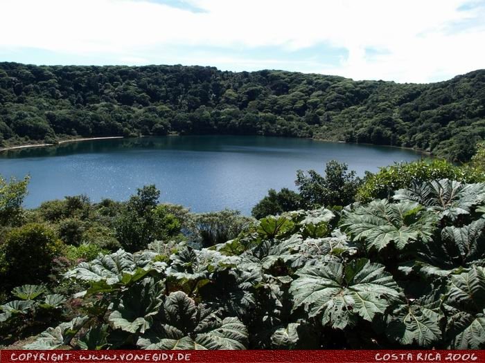 24.11. Tortuguero -> Moín -> Vulkan Poas 215 km Um fünf Uhr piepst der Wecker. Keine lange Nacht zumal die blöden Hähne der Nachbarn uns ab zwei Uhr immer wieder geweckt haben. Ohne Frühstück geht es mit zwei Kanus los. Wir paddeln langsam und leise durch kleinere Arme des Flusslabyrinths und Barbara macht uns mit scharfem Blick auf viele Tiere und Pflanzen aufmerksam. Wir sehen Basilisken, Kapuziner- und Klammeraffen, einen Kaiman, Blau- und Grünreiher und viele andere Vögel. Nach einem kurzen, gehetzten Frühstück legt um zehn Uhr das Boot zurück nach Moín ab. Diesmal brauchen wir nur drei Stunden. In zügiger Fahrt kommen wir durch die nebligen Berge zum Vulkan Poas. Kurz vor dem Nationalpark erreichen wir auf einer wirklich üblen und steilen Piste (nur 4x4!) die Lagunillas Lodge (072). Die Cabinas sagen uns nicht zu, aber die einzelne, einfache, kleine Berghütte ist sehr urig und charmant. „Warm“wasser wird durch eine Spirale über dem Gaskocher erhitzt, reicht aber nur für einen dünnen, lauwarmen Strahl. Wir schlafen unter vier Decken, es sind nur noch 13 Grad. Der Blick von der eigenen kleinen Terrasse erstreckt sich weit über das Tal. Man fühlt sich wie auf der Alm.
