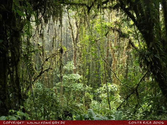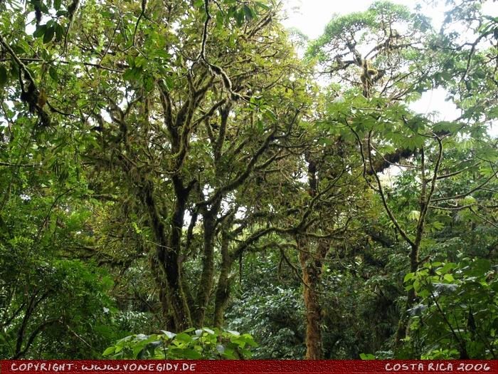 26.11. Monteverde (Santa Elena NP) 16 km In der Arco Iris Lodge (083) finden wir eine einzeln stehende, sehr schöne Hütte. Wir wollen für die letzten Tage unser eigenes Häuschen. Auch hier gibt es richtiges heisses Wasser, was plötzlich wichtig geworden ist. Es ist in dieser Höhe deutlich kühler geworden und neben den langen Hosen kommen abends nun auch die Fleecejacken zum Einsatz. Wir entscheiden uns gegen den Monteverde NP und für den Santa Elena NP. Beide sollen nahezu identisch sein, aber man empfiehlt Santa Elena, weil deutlich weniger Menschen hierher gehen. Zusätzlich ist der Eintritt mit immerhin noch 10 USD p.P. etwas günstiger (Monteverde NP – 13,50 USD p.P.). Die Trails führen durch einen dichten, nebligen Märchenwald. Alles ist mit Moos überzogen, alle Bäume tragen Massen an Epiphyten und es gibt riesige Farne. Ein sehr schöner Nebelwald, der unbedingt eine Wanderung wert ist. Allerdings sehen wir keine Tiere.