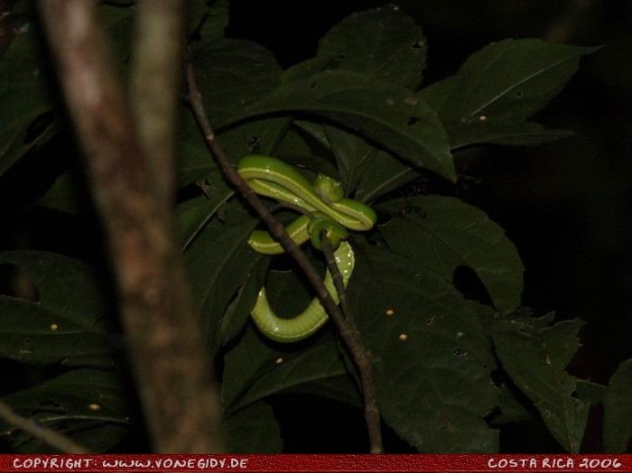 27.11. Monteverde 5 km Wir relaxen den Tag über mit viel Lesen und Fotografieren. Gegen Abend (17:30 - 19:30) mache ich eine Night Tour im Refugio del Vida Silvestre. Die Gruppen sind max. acht Personen gross, so ist es noch ganz erträglich. Die Führerin findet mit starker Taschenlampe und sehr gutem Blick einige Tiere. Wir finden etliche Insekten, kleine Spinnen, eine hübsche Tarantel, eine grüne Viper und ein Faultier.