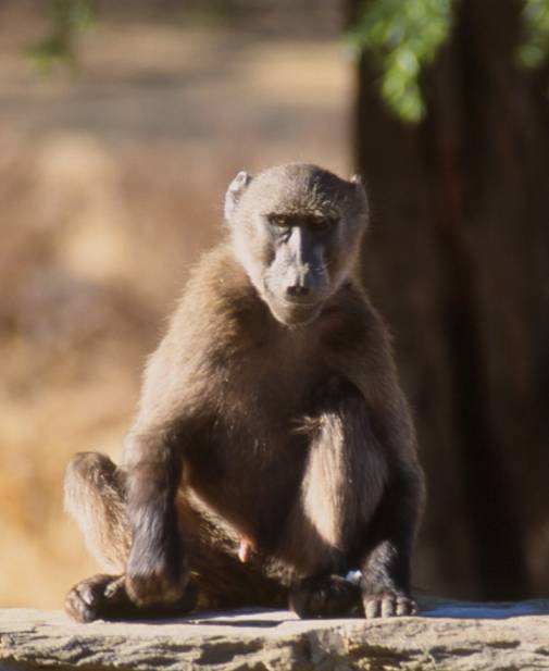 Bande zurück. Ein Pavian setzt sich sehr fotogen im Schneidersitz in die