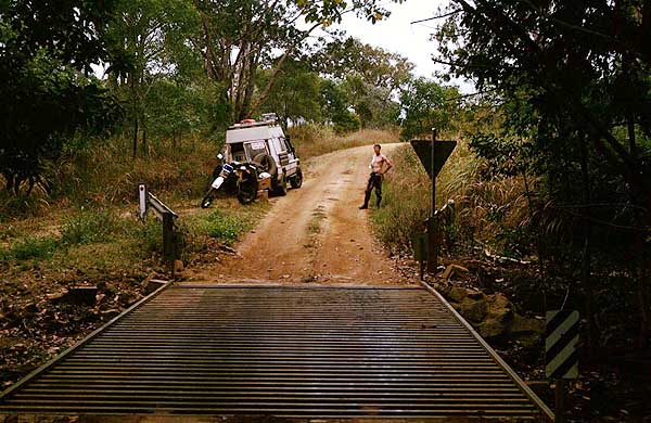 Der Unfall Nach Musgrave, Coen und Archer River Roadhouse kommt ein Abzweig zum Iron Range N.P. an der Ostküste. Dieser Weg ist wieder nur für 4WD geeignet, allerdings mit etwas Übung gut zu fahren. Die Durchquerung des Wenlock und Pascoe Rivers sind hier noch recht einfach. Im Park angelangt, fährt man durch wunderschönen, dichten Regenwald hinauf bis zum Chilli Beach. Leider bin ich dort nie angekommen. In Cairns hatte ich Rainer aus Deutschland kennen gelernt. Er wollte mit seinem Motorrad ebenfalls zum Cape York hinauf und so beschlossen wir die Strecke gemeinsam zu fahren. Da er mit dem Motorrad um einiges schneller vorankam als ich in meinem Landcruiser, verabredeten wir immer wieder Treffpunkte entlang der Strecke, wo er dann auf mich wartete. Kurz vor Chilli Beach steht Rainer hinter einer kleinen Brücke und wartet auf mich. Merkwürdigerweise kann ich sein Motorrad nirgends entdecken. Als ich die Brücke überquere, sehe ich es in einem Graben neben der Straße liegen. Die Koffer sind verbeult und einer steht abgerissen im Weg. Rainer sieht bei näherer Betrachtung auch etwas verbeult aus. Seine rechte Schulter ist merkwürdig deformiert und schmerzt ihn. Ansonsten hat er nichts abbekommen. Schuld an dem Dilemma ist die gerade überquerte kleine Stahlbrücke. Durch die Nässe extrem rutschig ist sie Rainer zum Verhängnis geworden. |