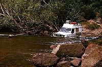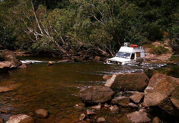 | Wann genau kippt der Wagen mit dem Aufbau und bei dieser Gewichtsverteilung eigentlich? Aus Erfahrung weiß ich, dass er es bestimmt nicht vor 30 bis 35 Grad tun wird, aber wohl ist mir manchesmal trotzdem nicht. Die eigentliche Schwierigkeit der Strecke liegt aber in den Flussdurchfahrten. Die Wassertiefe selbst ist in dieser Jahreszeit nicht so sehr das Problem. Selten steigt das Wasser über die Motorhaube und in einem Dieselfahrzeug mit Schnorchel (nach oben verlängerter Luftfilter) ist das ohnehin nicht so problematisch. Viel mehr sind es die Böschungen, die abenteuerlich zu befahren sind. Alle sind sie extrem steil und oft nur im ersten L4 zu meistern. Manche sind tiefsandig, andere schlammig und einige wiederum felsig, jede aber auf ihre Art heftig. Trotz Entschärfung ist der so genannte Gunshot, die Durchquerung des gleichnamigen Creeks, die schwerste auf der südlichen Strecke. Von Süd nach Nord lässt er sich allerdings inzwischen ohne Windeneinsatz befahren. |