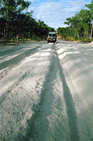 Lakefield Nationalpark Cooktown ist der letzte größere Ort auf dem langen Weg zum Top und bietet noch einmal den Komfort eines voll ausgestatteten Campingplatzes und eines recht gut sortierten Supermarktes. Die Küste verlassend, vorbei an den kleinen Endeavour Falls, führt die nun wirklich nur noch für Allradfahrzeuge (4WD) geeignete Strecke in den sehr schönen Lakefield N.P.. Von vielen Flüssen durchzogen und herrlich grün lädt der Park zu einigen Abstechern und eigentlich längerer Verweildauer ein. Hierfür gibt es, wie in fast allen Australischen Nationalparks, einfache Bushcamps mit Pit-Toiletts (Plumsklos) an meist sehr schön gelegenen Stellen. Das "wilde" Campen ist in den Nationalparks nicht erlaubt. Wenige Kilometer nach dem Verlassen des Lakefield N.P. stößt man auf die Peninsula Developmental Road, die in recht ordentlichem Zustand bis hinauf nach Weipa führt. Die dort ansässige Mienengesellschaft sorgt für die Erhaltung der Straße, was allerdings nicht bedeutet, dass es auch nur ein Fitzelchen Teerbelag gibt. Trotzdem kann man einmal ein Stück mit zügigen 80 km/h fahren. Allerdings muss man immer auf der Hut vor Auswaschungen und Bulldust-Löchern sein. Bulldust, dieser tausendfach zermahlene Sand, setzt sich als mikrofeiner Staub auf den Straßen ab. Er sorgt nicht nur für permanente riesige, nahezu undurchsichtige Staubfahnen, sondern verbirgt auch sehr gern tiefe Löcher. Fährt man nun mit überhöhter Geschwindigkeit in so ein verborgenes Loch, kann das zu einer bösen Überraschung führen. Im schlimmsten Fall kann das Ganze mit einem Überschlag oder dem unfreiwilligen Verlassen der Straße in Richtung Busch enden. |