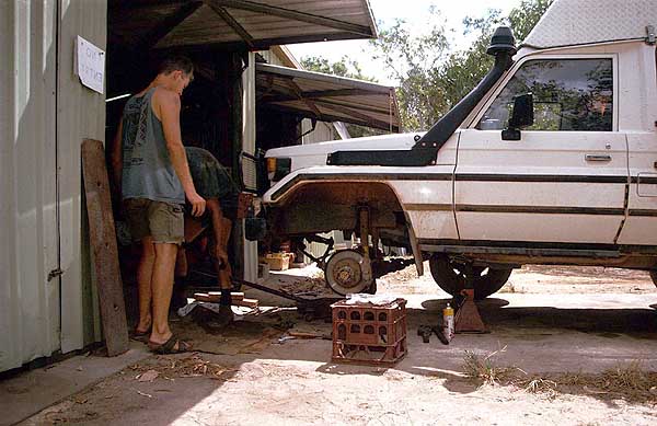 Hier lassen wir uns am nächsten Tag übersetzen (80 $ return für etwa 150 m !!) und kommen, mit Besichtigungsstop an einem DC3-Wrack am Wegesrand, über Bamaga nach Seisia. Bei Bob, einem der Mechaniker im Ort, fragen wir nach einer Ersatzfeder aber es ist keine vorhanden. Er bietet an, die gebrochene Feder zu schweißen, aber davon halte ich nicht allzu viel. Nur wenn es gar nicht anders geht, möchte ich mich darauf einlassen. Da er ohnehin erst in zwei Tagen Zeit für mich hat, fahren wir ersteinmal über einen kaum befahrenen Nebenweg hinauf nach Punsand Bay auf den wunderschönen Strandcampingplatz. Auch hier funktioniert das "Buschtelefon" bestens, es wissen schon alle Bescheid, dass der "left hand driven" Toyota mit der gebrochenen Blattfeder auf dem Weg hierher ist. Wayne, der äußerst nette und hilfsbereite Mechaniker der Tourgesellschaften, kommt zur Hilfe und hat tatsächlich eine neue Blattfeder zu einem durchaus zivilen Preis für mich. Am nächsten Tag baue ich sie zusammen mit Wayne ein. |