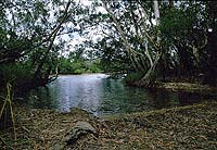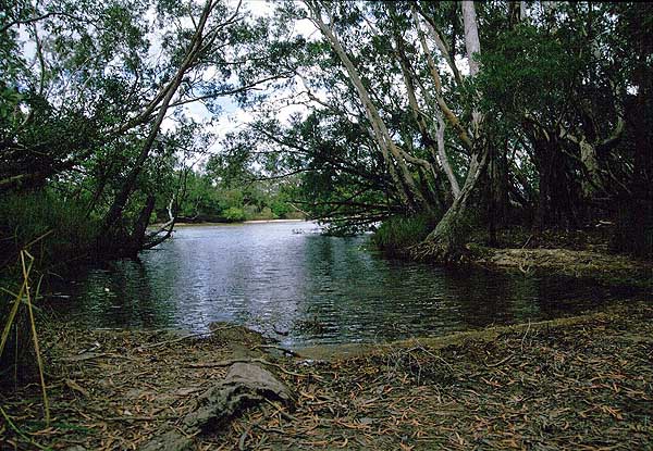 The Top Mit nun wieder genesenem Auto erkunden wir die nähere Umgebung, natürlich zuerst einmal den nördlichsten Punkt selbst. Nach einem Stück Fußmarsch ist das Top erreicht. Der zugige Punkt wird durch ein Schild gekennzeichnet, direkt da wo es von den Klippen ins Wasser geht (S10°41,41 E142°31,82). Der Ausblick auf die nahe gelegenen Inseln ist nett, aber außer dem Gefühl es geschafft zu haben, gibt es nichts Besonderes. Von Somerset an der Ostküste führt ein kleiner, ruppiger Weg, teilweise direkt am Strand, zum Sheridan Point und wieder zurück zur "Mainroad". Hier findet man einsame, allerdings sehr windexponierte Strände, die man ganz für sich allein hat. Wir verlassen die Nordecke des Cape und schauen uns auf dem Rückweg die Furt durch den Jardine River an. Man hat uns überall eindringlich davor gewarnt hindurchzufahren. Die Aboriginals wollen, dass man ihre Fähre benutzt und haben angeblich tiefe Löcher hineingegraben. Außerdem ist eine sehr tiefsandige Sandbank in der Furt. Ein Team mit mehreren Land Rovern hat es versucht und sie mussten sich durchwinschen. Die Geschichte von meinem Freund Karl, der mit seinem Allrad-LKW fast drei Tage im Fluss steckte und nur mit großer Mühe und beträchtlichem finanziellen Aufwand befreit werden konnte, habe ich auch immer noch im Kopf und so siegt die Vernunft. Wir nehmen wieder die Fähre. |