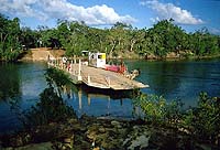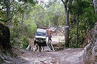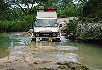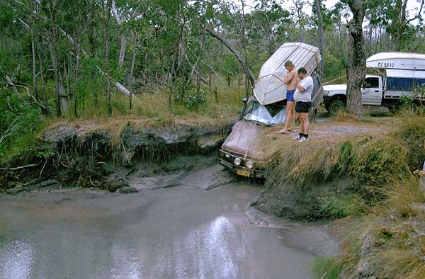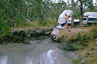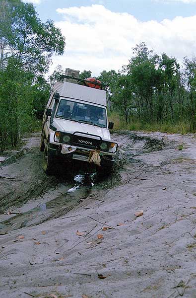 Am nächsten Tag fahre ich die Maschine zur Werkstatt der Komune. Hier verspricht man Rainer, den Transport nach Cairns mit einem Boot am nächsten Montag zu erledigen. Da Rainer unter dem Bruch nicht allzu sehr leidet, beschließen wir gemeinsam in meinem Toyota weiter zum Tip hinaufzufahren. Für den Rückweg aus dem Iron Range N.P. wählen wir die nördliche Route, die sich als recht heftig erweist. Besonders diese Furt durch den Pascoe River hat es in sich. Die Abfahrt am östlichen Ufer ist recht steil und der Fluss ist knapp einen Meter tief. Am westlichen Ufer geht es dann über Felsen extrem steil nach oben. Im ersten Gang der Allraduntersetzung (L4) arbeiten wir uns langsam hinauf und der Landcruiser muss mal wieder seine Geländetauglichkeit unter Beweis stellen. Die folgende Furt des Wenlock Rivers ist dagegen einfach zu nehmen. |