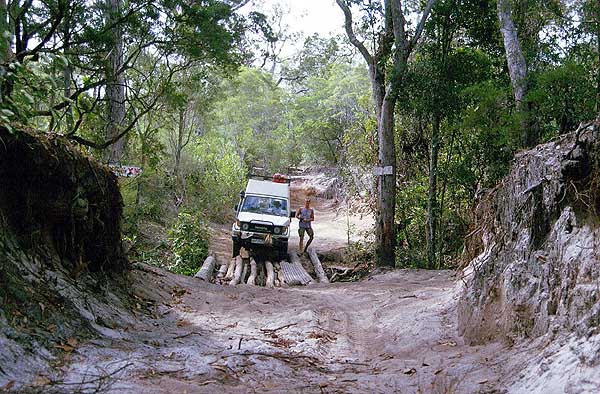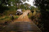 Die Old Telegraph Road Über die Frenchmans Road erreichen wir wieder den eigentlichen Weg zum Top, die Old Telegraph Road (OTR). Kurz vor der Moreton Telegraph Station, die als Campsite von einem sehr netten Ehepaar betrieben wird, ist wieder einmal der Wenlock River zu durchfahren. Für uns stellt er wegen des recht niedrigen Wasserstandes kein Problem dar. Bilder in Moreton zeigen allerdings, dass er schnell unpassierbar wird. Vor einigen Jahren haben hier Leute aus Fässern und Baumstämmen ein Floß gebaut, um ihr Auto auf dem Rückweg vom Top hinüber zu bekommen. Nach weiteren 38 km fängt das wirkliche Abenteuer an. Östlich zweigt die Southern Bypass Road ab, die es einem ermöglicht ohne die Benutzung des nicht gewarteten Teils der Old Telegraph Road bis zum Cape zu kommen. Diese Bypass Roads werden auch von den meisten Tourgruppen benutzt. Wir bleiben natürlich auf der OTR. Nun wird es richtig hart. Die Durchschnittsgeschwindigkeit liegt jetzt so um die 20 km/h. Die Strecke ist extrem ausgewaschen und mit tiefen Löchern übersät. Schräglagen bis über 25° sind keine Seltenheit und durchaus geeignet, um einem echte Sorgen zu machen. |