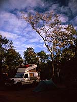 | Abends sitzen wir bei einigen Bierchen gemütlich mit Wayne, den Tourguides und den Leuten vom Camp zusammen und lauschen all den Cape York Storys. Es stellt sich heraus, dass kaum ein Fahrzeug ohne Reparaturen den Weg hinauf und wieder zurück übersteht. Aber das Cape hat einfach eine ungeheure Anziehungskraft. Vor allem die Off-Road begeisterten Australier selbst müssen wohl unbedingt einmal hier gewesen sein. Ich kann das gut verstehen. Es kommen nur wenig selbst fahrende Ausländer hier hinauf, Touristen bevorzugen die Tourgesellschaften. Dies liegt wohl auch mit daran, dass die 4WD-Vermieter -aus gutem Grund- es meist verbieten, mit ihren Wagen hier heraufzuzfahren. Dafür ist aber schon ein Japaner mit seiner Rickscha (von dem liest man ja häufiger mal), eine Frau mit einer Pferdekutsche, Fußgänger und natürlich Radfahrer hier oben gewesen. |