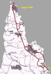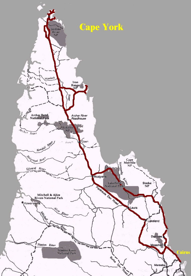 Das Cape York (Pajinka), von den Australiern meist einfach nur TOP oder TIP genannt, ist der nördlichste Festlandpunkt Australiens und liegt auf einer großen Halbinsel im Nordosten von Queensland. Von Cairns "nur" 770 km Luftlinie entfernt, entpuppt sich der Landweg als harte, unwegsame Strecke. "Noch immer die härteste Allrad-Strecke im ganzen Land", sagen die Australier. Dass dies trotz einiger inzwischen vorhandener "Entschärfungen", ausnahmsweise mal nicht übertrieben ist, soll ich bald darauf erfahren. Für den Hinweg entscheide ich mich für die Küstenstrecke von Cairns über das schöne Port Douglas zum Cape Tribulation. Cape Tribulation mit seinem üppigen, bis an den Strand reichenden Regenwald, ist fest in den Händen der "Backpacker". Das zeigt sich besonders an den allabendlichen Partys. Den Daintree Nationalpark (N.P.) verlassend führt die teilweise an die 20 Grad (fast 45% !) steile Strecke durch den Cedar Bay N.P. und den Black Mountain N.P. nach Cooktown. Mit etwas Vorsicht und Fahrerfahrung lässt sich dieses Stück bei Trockenheit auch mit einem robusten, kräftigen PKW bewältigen. |