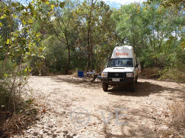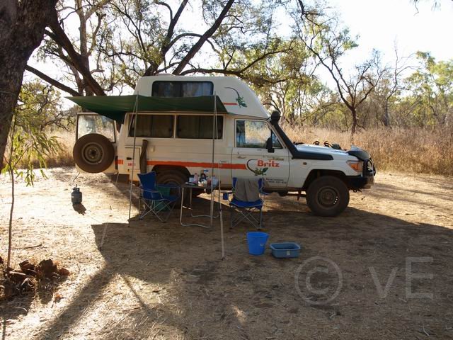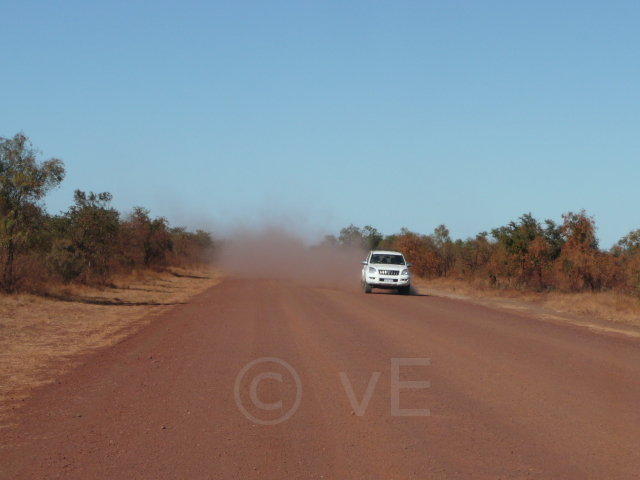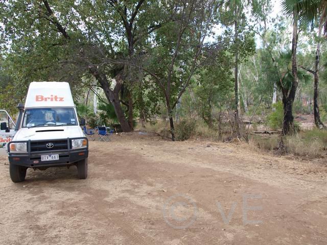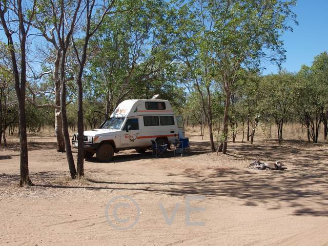 River 622km Der Ranger teilt uns am nächsten Morgen mit, dass der Park, auf Grund des starken nächtlichen Regen, heute gesperrt ist. Wir dürfen entweder stehen bleiben, oder aber den Park verlassen. Zum Glück haben wir alles besucht und machen uns daher auf den Rückweg. Es wird eine abenteuerliche Fahrt. Der Regen hat die Piste total aufgeweicht und in einen schlammigen, glitschigen Pfad verwandelt. Trotz Allrad fahren wir im permanenten Drift, immer an der Grenze zwischen Steckenbleiben oder von der Piste rutschen. Für die 16km bis zum Eingang brauchen wir eine halbe Stunde. Die restliche Strecke ist deutlich besser, wir kommen gut voran und erreichen recht zügig die Hauptstraße. Über Kunnunarra geht es auf schneller Teerfahrt weiter ins Nothern Territory. Hier wird die Uhr 1 1/2h (!) vorgestellt. Wir düsen bis Victoria River [112], der letzten offiziellen Campingmöglichkeit vor Katherine und der Dunkelheit. 9 1/2h Fahrt reichen wirklich. Der Campingplatz besteht einfach aus einer großen, schiefen Wiese hinter einem Roadhouse. Es ist nicht gerade leise, die Nacht dadurch nicht wirklich erholsam.