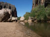 (13) 27.08. El Questro 18km Die El Questro Gorge ist unser erstes Ziel [Kreuzung 050, Parkplatz 053]. Als Spätaufsteher laufen wir erst in der Mittagszeit bei 35°C los. Das ist bei dieser Gorge aber nicht weiter tragisch, da sie sehr schmal ist und daher ausreichend Schatten bietet. Der palmensbestandene Fluß windet sich durch die wunderschöne Schlucht und der Weg ebenso. Mal geht man im Flußbett, mal umgeht man es, da sich größere Pools gebildet haben. Man kommt trockenen Fußes voran und muß nur wenig kraxeln. Das ändert sich völlig, nachdem man den tollen Half Way Pool erreicht hat. Direkt im hinteren Ende des Pools liegt ein riesiger Bolder, den man erst einmal aus dem gut hüfttiefen Wasser heraus erklettern muß (linke Seite). Dies ist quasi die Schlüsselstelle für den weiteren Weg. Ab hier klettert man munter über eine Verblockung nach der anderen. Man schreibt: "Only for expiriencened with very good condition", was sicher übertrieben ist. Trittsicher und mit einer gewissen Grundsportlichkeit ausgerüstet sollte man aber schon sein. Die Schlucht wird immer enger und nach einer guten 3/4 h (inkl. Fotostops) zügigem gekraxel ist das enge Ende mit einem kleinen Wasserfall und einem tollen Pool erreicht. Wieder einmal ein herrlich erfrischendes Bad im kristallklaren Wasser.