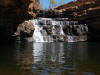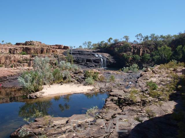 Gorge (Bell Creek) 14km Wir haben Glück und bekommen am frühen Morgen vom Ranger eines der wenigen Camps am Bell Creek. Normalerweise gibt es 10 Bushcamps, wegen eines Feuers sind aber nur 4 geöffnet. Die Sites liegen ein paar Meter vom Fluß entfernt und sind herrlich. Man steht herrlich einsam in schöner Natur [023]. Der Parkplatz zur Bell Gorge [024] ist nicht weit entfernt. Der Weg hinunter zum Fluß ist ein wenig "krakselig". Der erste Pool ist wirklich schön, die Pools unterhalb des Wasserfalls ebenso, die Gegend fantastisch. Das Schwimmen und Plantschen im eiskalten Wasser erfrischt ganz wunderbar. Auch die Umgebung lohnt die weitere Erforschung, es bringt viel Spaß auf den Felsen herumzukrakseln und immer wieder schönste Blicke erhöhen die Freude.