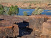 Mornington Wilderness Camp 87km Auf dem sehr schönen Weg zur Dimond Gorge liegt ein Lookout [035], von dem man einen prima Panoramablick über die Steppe hat. Vom Car Park der Schlucht [036] sind es nur ein paar Meter bis zum Fluß und den bereitliegenden Kanus (60$ Miete pro Tag). Es sind kaum mehr als 2km oneway zu paddeln, aber es ist sehr schön die tolle Landschaft vom Wasser aus zu genießen. Die roten Felsen liegen in so unterschiedlichen Schichten und Winkeln aufeinander, dass immer Neues zu entdecken ist. Folgt man kurz vor Ende der Strecke seinem Gehör, kann man, nach etwas Kraxelei, einen kleinen Wasserfall finden. Auch die kleinen Strände laden immer wieder zu einem Stopp ein. Auf dem Rückweg machen wir einen kleinen Abstecher zum Cajeput [037], einem schönen Uferstück an einem recht breiten Flüßchen.