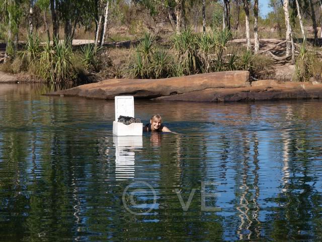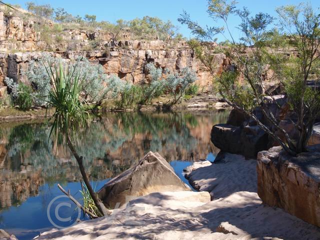 Beobachtungen, und das obwohl wir schon sehr früh dort wandern. Galvans Gorge [039] ist eine kleine Schönheit quasi direkt an der Piste. Ein einfacher, ca. 500 Meter langer Weg führt zu einem sehr schönem kleinen Pool mit ebensolchem Wasserfall. Ein tolles Planschbecken mit kleiner Aboriginal-Zeichnung und Wassermonitoren. Mt.Barnet Road House [040] ist gerade einmal 20km entfernt. Auch hier kann man (teuer) tanken und ein paar Lebensmittel kaufen. Es gibt einen Schlauch mit Trinkwasser, aber keine Füllung für die Gasflasche! Auch die Camping- und Eintrittsgebühr für die Manning Gorge wird hier entrichtet. Das Camp an der Manning Gorge [042] liegt wenige Meter hinter dem Road House. Es ist sehr groß, wenig sauber und nicht wirklich schön angelegt. Aber der kleine See mit hübschen kleinen Inseln und tollem, sandigem Ufer ist wirklich schön. Und die Manning Gorge selbst ist paradiesisch und mit Sicherheit eine der allerschönsten Schluchten in den Kimberleys. Ein echtes Highlight. Wir entschließen uns für den Weg zur Gorge mit der Abkürzung anzufangen. Sie führt direkt durch den See am Camp. Freundlicherweise liegen Styroporkisten herum, in denen man schwimmend seine Sachen trocken auf die andere Seite bringen kann. Wer dies nicht mag, kann auch außen herum laufen, dauert vielleicht ein halbes Stündchen länger. Der Weg ist in der Hitze nicht ohne, zumal es so gut wie keinen Schatten gibt. Man wird ein Stunde lange gut gegrillt. Die Gorge bietet einen derartig grandiosen Anblick, dass man gar nicht mehr aufbrechen mag. Kleine Strände mit Palmen, kristallklares Wasser, schöne Felsen und einen ansehnlichen Wasserfall, einfach Top.