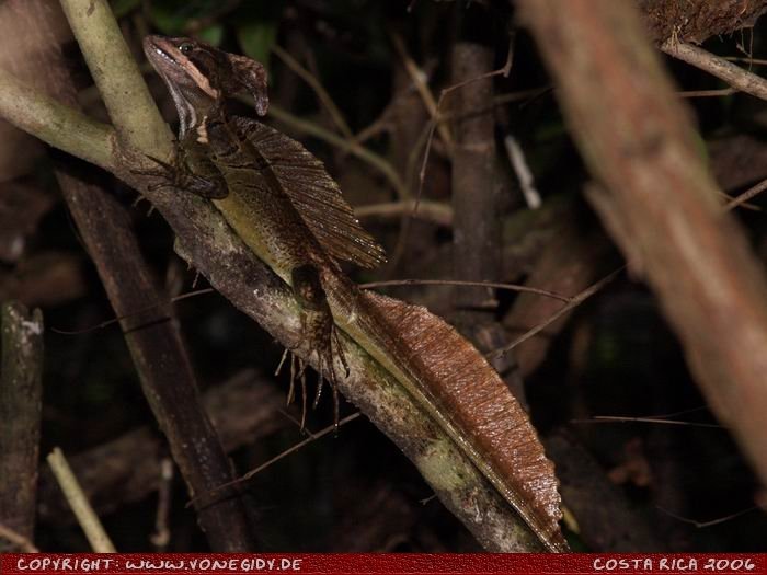 27.11. Monteverde 5 km Wir relaxen den Tag über mit viel Lesen und Fotografieren. Gegen Abend (17:30 - 19:30) mache ich eine Night Tour im Refugio del Vida Silvestre. Die Gruppen sind max. acht Personen gross, so ist es noch ganz erträglich. Die Führerin findet mit starker Taschenlampe und sehr gutem Blick einige Tiere. Wir finden etliche Insekten, kleine Spinnen, eine hübsche Tarantel, eine grüne Viper und ein Faultier.